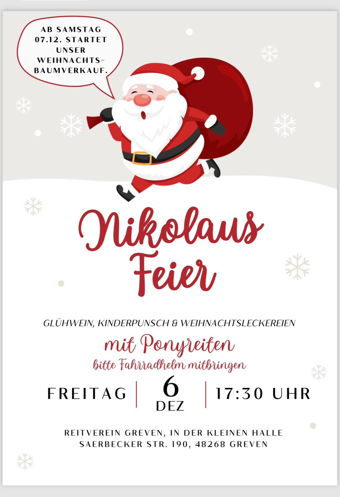 Am morgigen Samstag, den 06. Dezember kommt der Nikolaus in unsere Reithalle. Die Feier beginnt um 16.30 Uhr mit Punsch, Kakao, Würstchen, Snacks und Weihnachtsmusik.